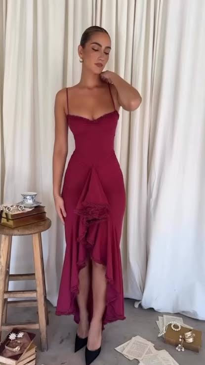 The striking ruffle front of 'Gabbi' may be the first thing you notice but it's only one of many beautiful details.  Glamorous with a vintage style, 'Gabbi' has the most beautiful silhouette that's perfectly gathered at the hip. This gorgeous wine gown falls to a flirtatious waterfall ruffled front for plenty of drama.
