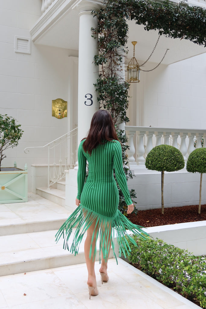 This stunning piece is knitted in a vibrant green hue that's sure to turn heads. But what really sets it apart is the swaying fringe detail that adds a touch of drama and movement to your every step.
