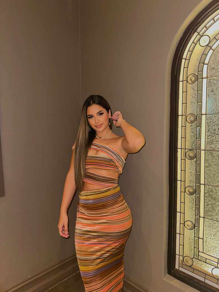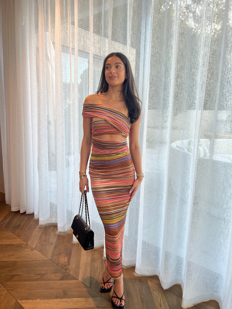 The statement Rainbow knit everyone is talking about. Flattering cut outs which accentuate your figure complete with a high neckline.