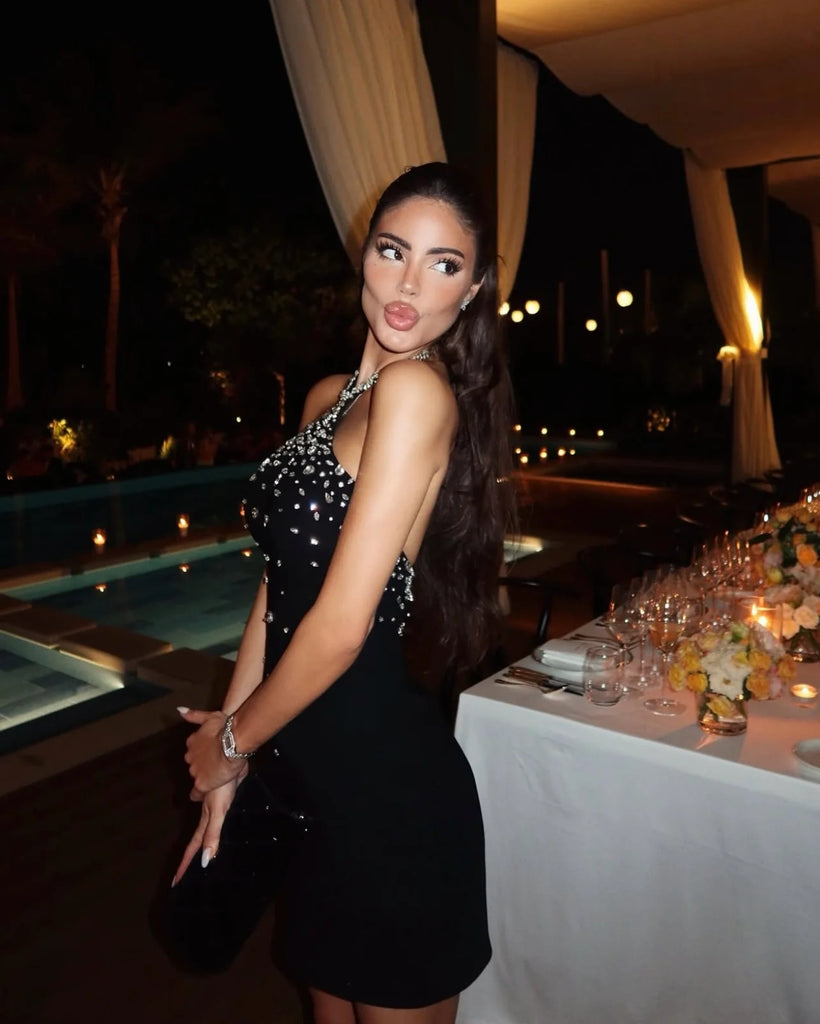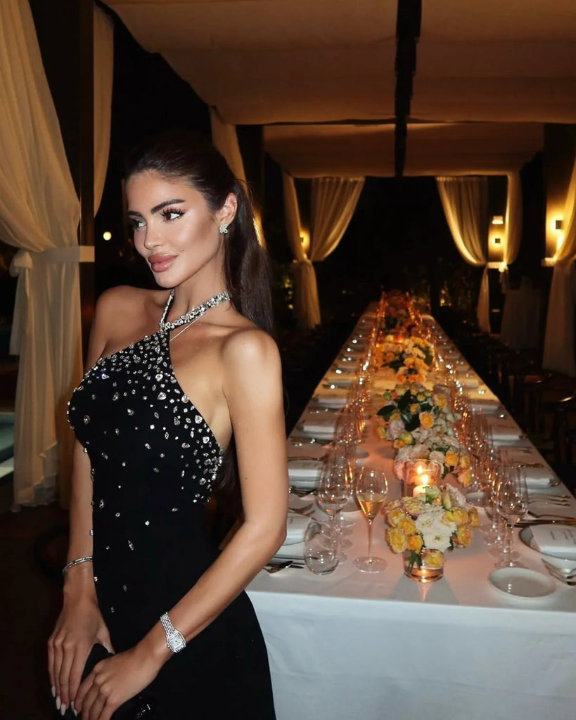 This black fitted mini dress combines elegance and sparkle. It features a chic halter neckline that gracefully frames the shoulders and collarbone. Rhinestones are densely clustered at the collar and upper hem, gradually fading as they descend towards the waist.